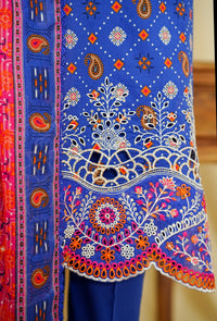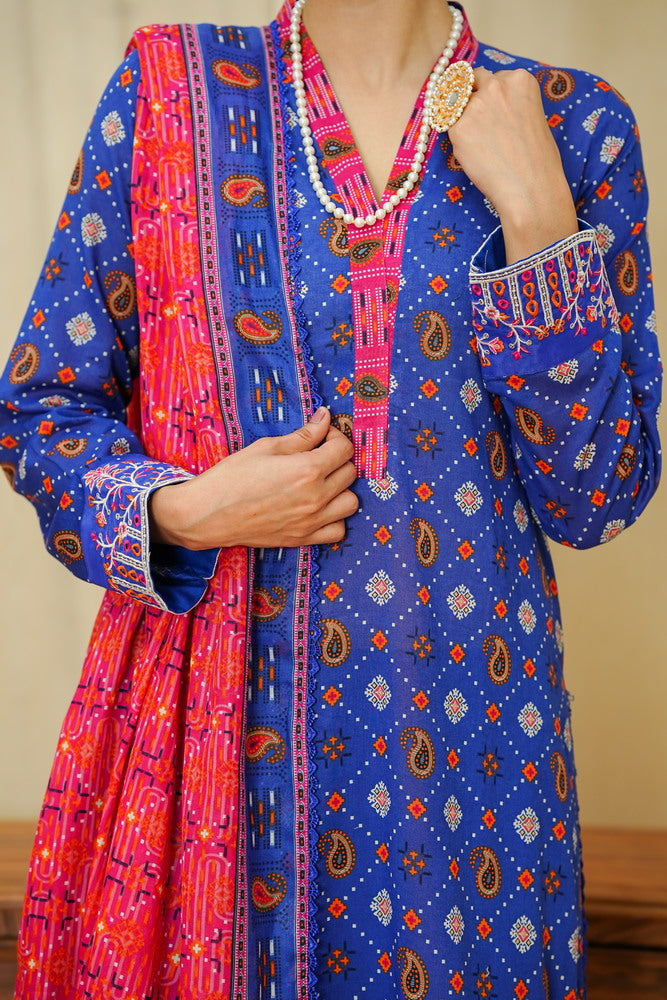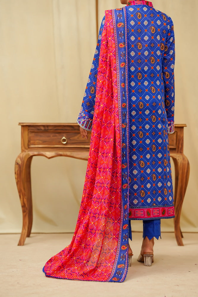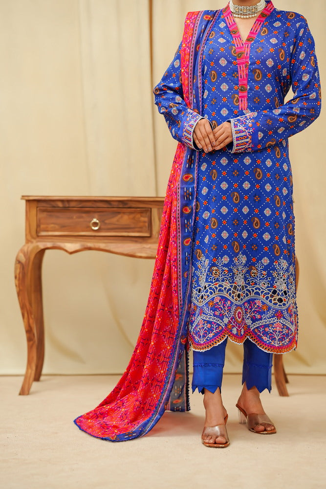 DESCRIPTION: TOP QUALITY THREE PIECE UNSTITCHED EMBROIDERED DRESS WITH PRINTED LAWN DUPATTA.