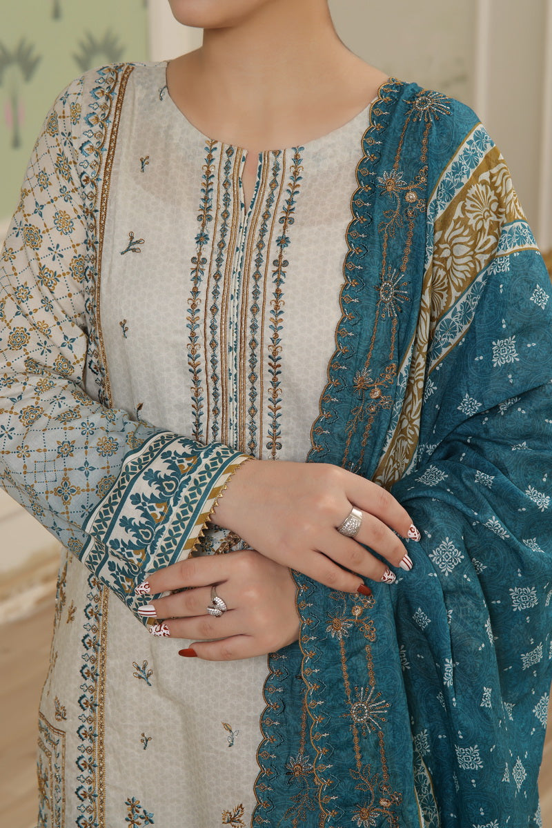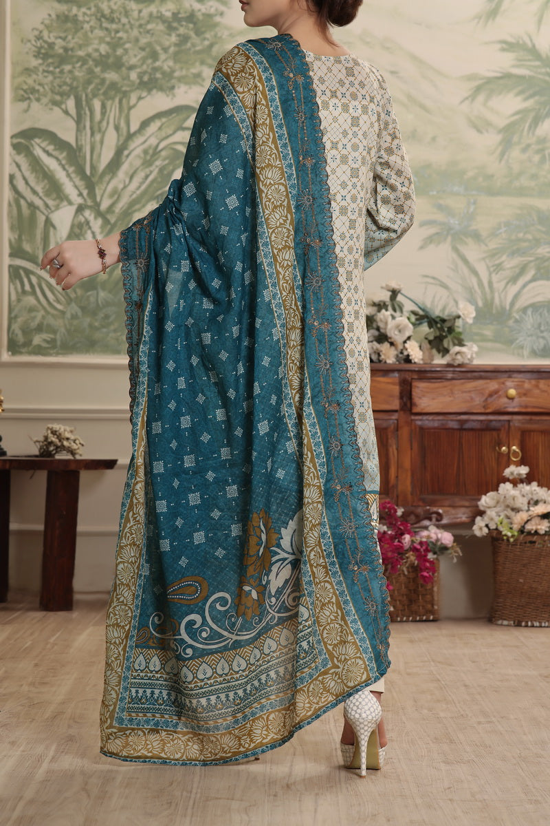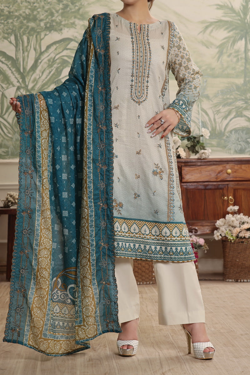 DESCRIPTION: TOP QUALITY THREE PIECE DIGITAL EMBROIDERD AIRJET LAWN DRESS WITH EMBROIDERED DUPATTA