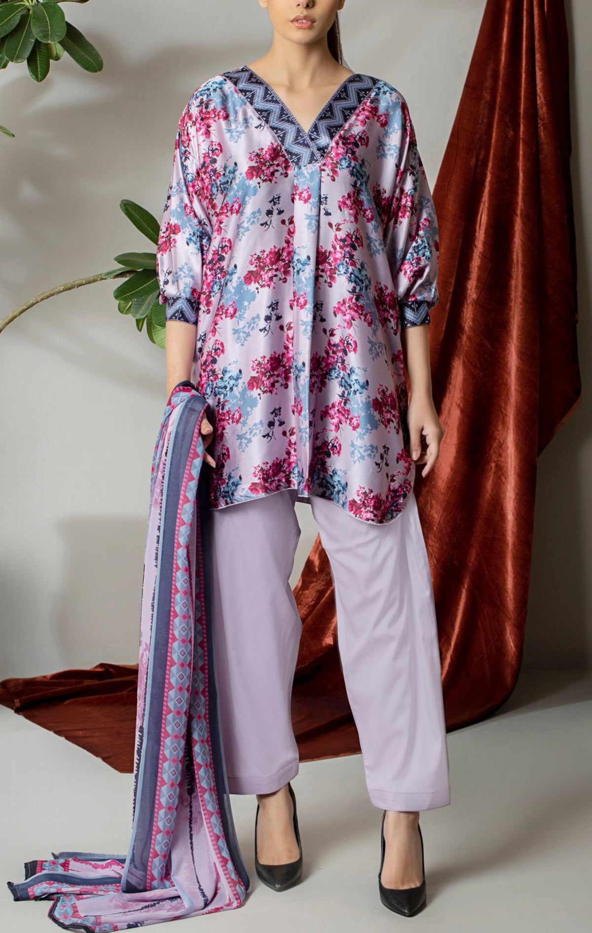 DESCRIPTION: THREE PIECE DIGTAL PRINTED UNSTITCHED LUXURY SILK DRESS.