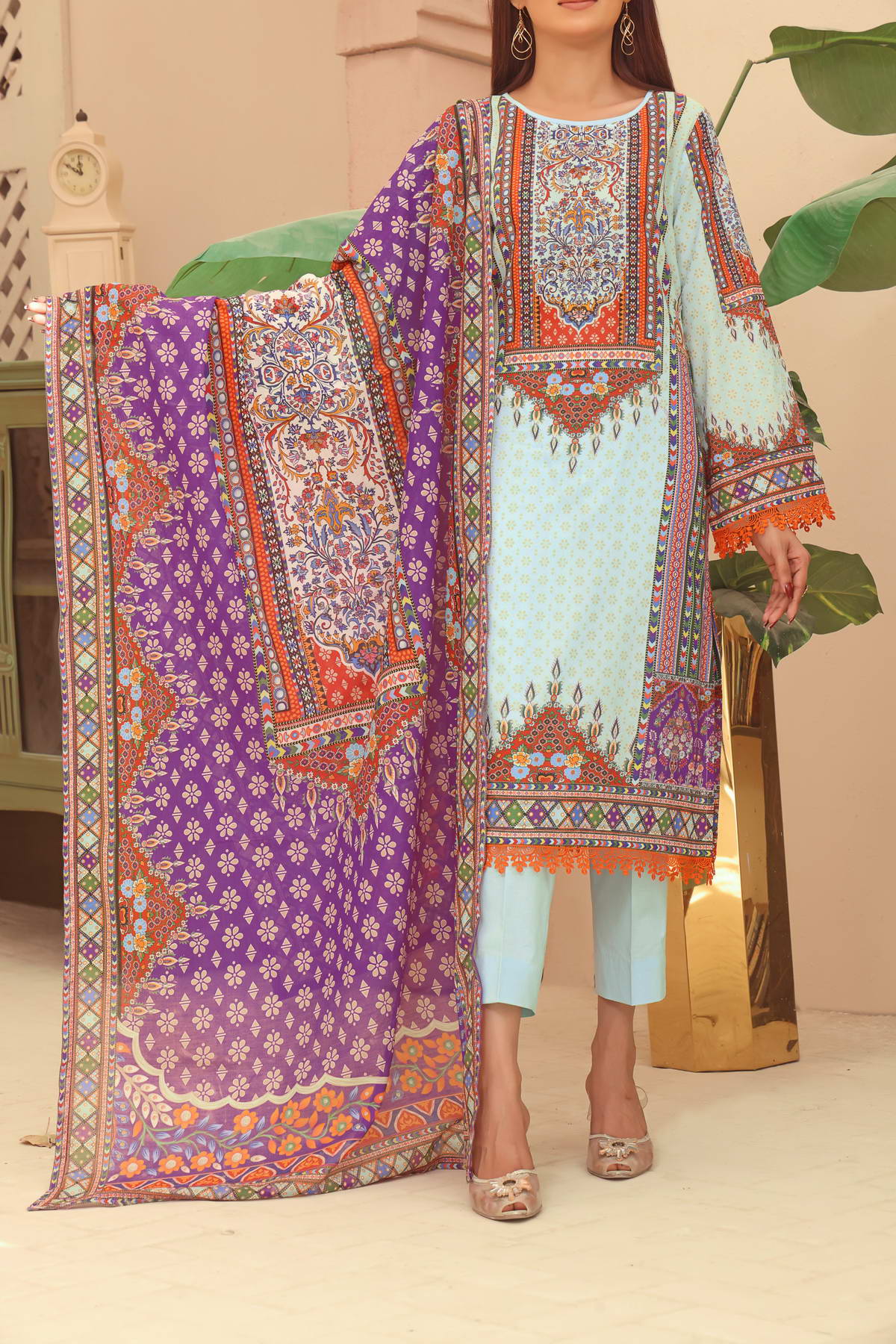 DESCRIPTION: FINE QUALITY UNSTITCHED THREE PIECE DIGITAL AIRJET LAWN DRESS.