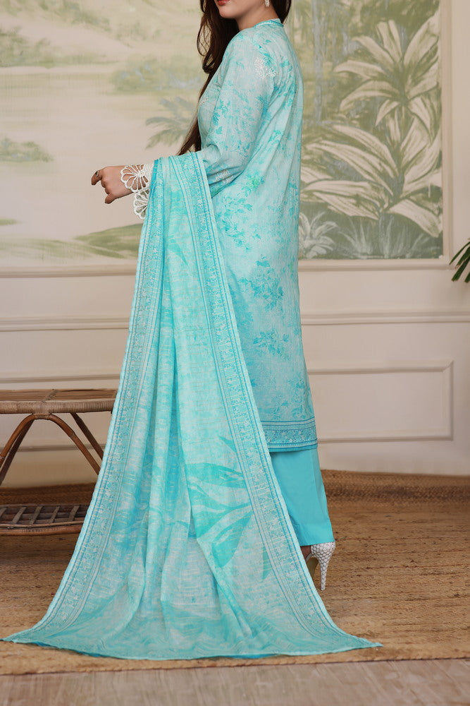 DESCRIPTION: TOP QUALITY THREE PIECE UNSTITCHED PRINTED DRESS WITH CHIKANKARI DAMAN